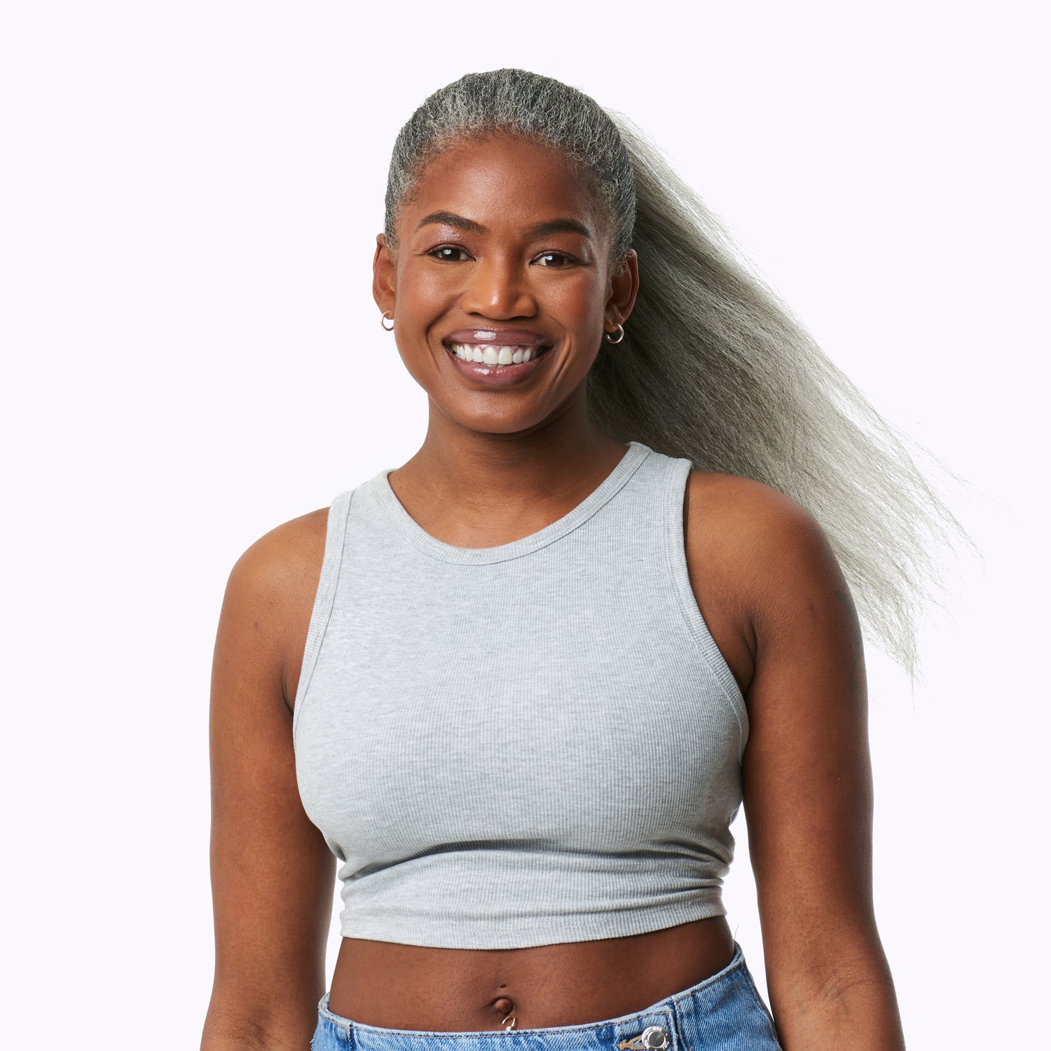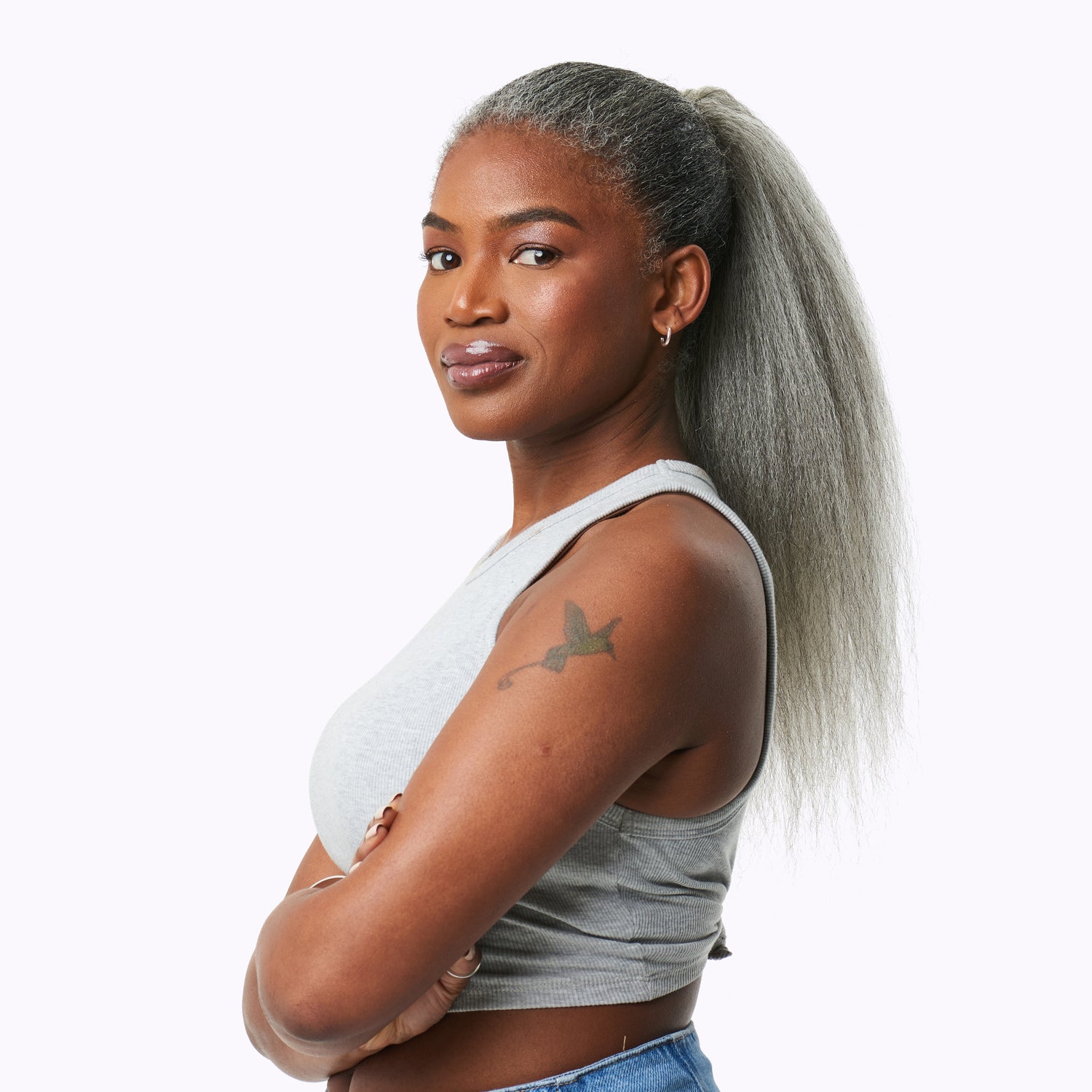 Shannel wears Press’d Ponytail in 16” (Gradient: Steel)